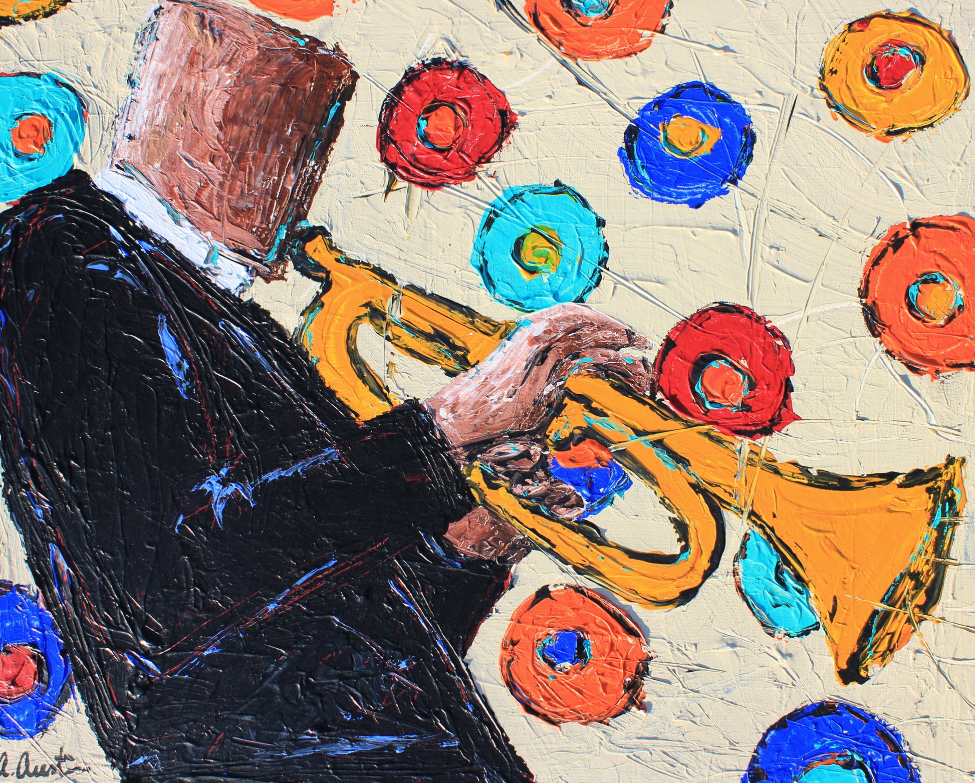 A celebration of music, color, and joy—this painting brings the sound of the trumpet to life visually, making it a standout piece for any art collection.