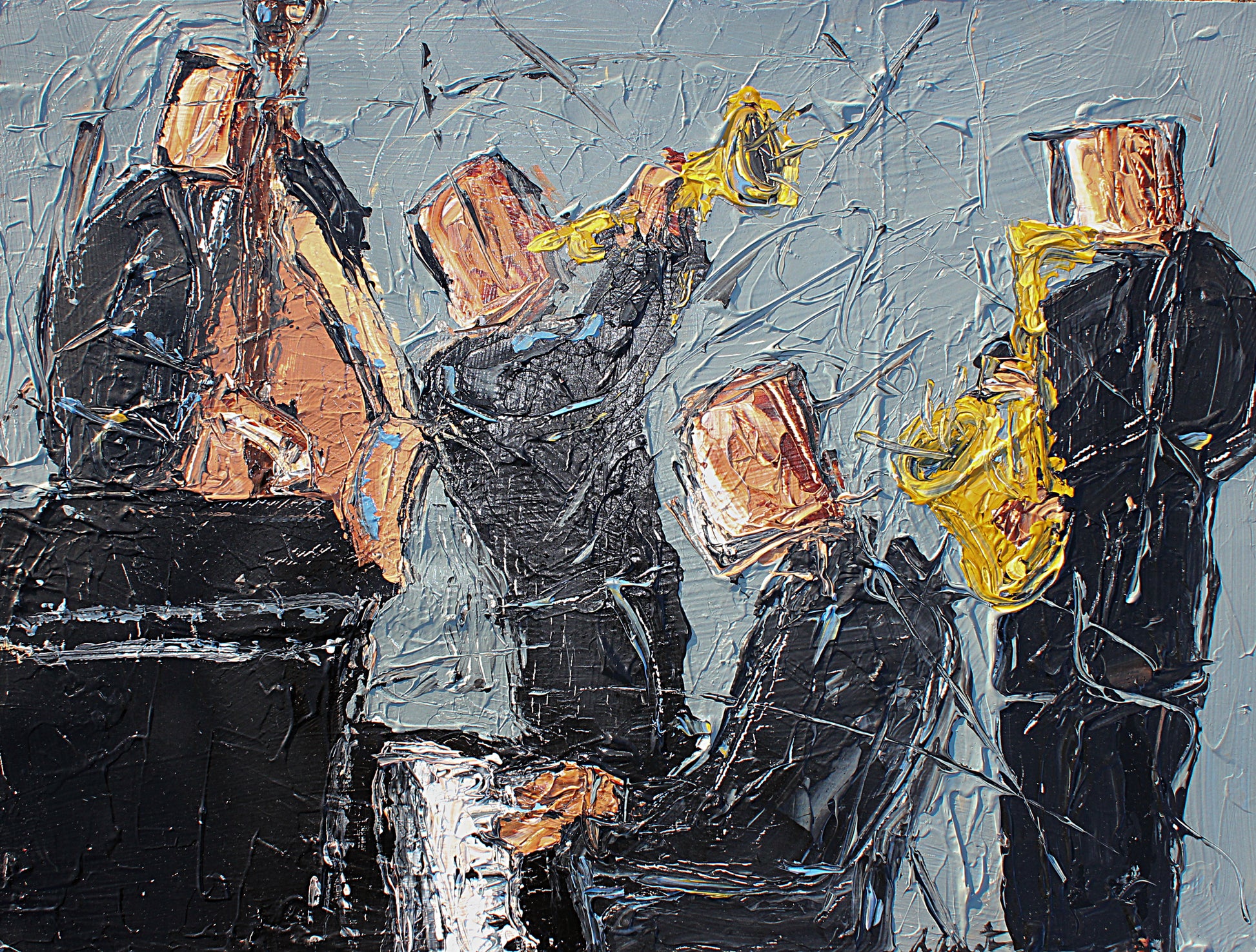 Thick layers of paint create depth and rhythm, giving each musician a sense of motion as if they’re caught mid-improvisation. The warm tones of the instruments and the copper block-heads stand out beautifully against the cool gray, making this piece both bold and sophisticated.