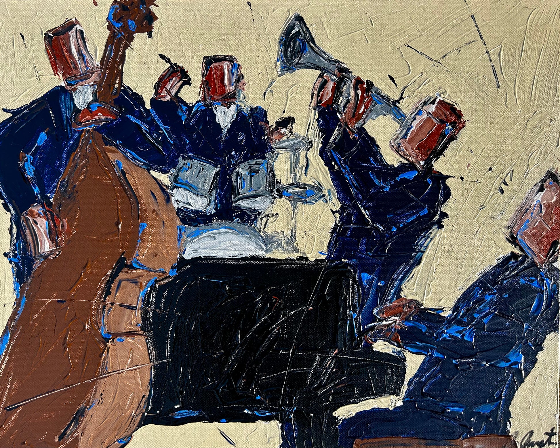 This 16x20 original painting captures the intensity of a small jazz combo deep into the night—when the room is quiet, the crowd is gone, and the music gets real. Heavy palette-knife strokes and thick acrylic layers give this piece weight and presence. You can see the pressure in the marks. Nothing is soft. Nothing is accidental.
