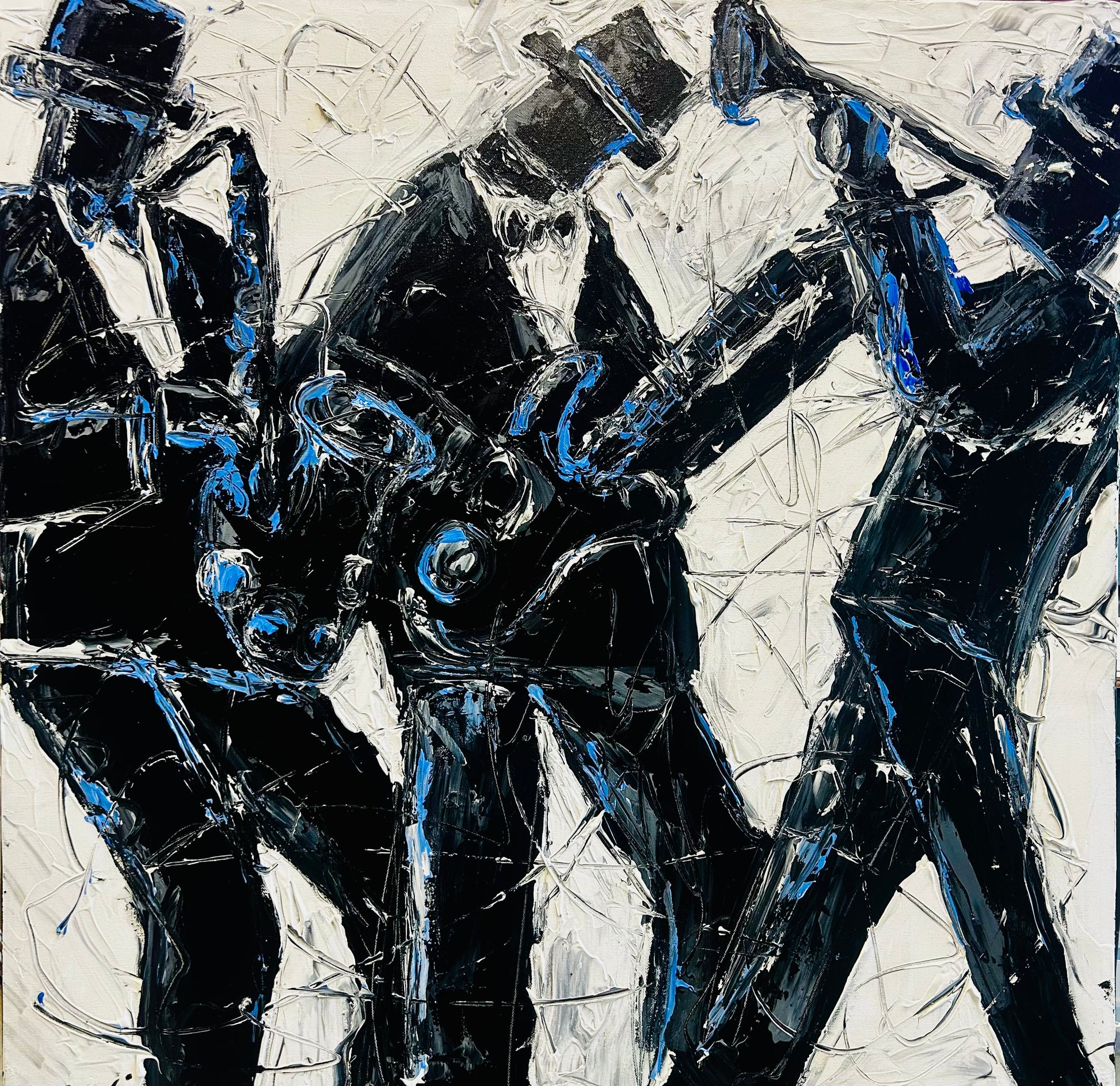This piece hits you with pure attitude — three block-head musicians locked into a hard, electric rhythm that feels alive the moment you look at it. Heavy palette-knife texture, thick blacks, sharp whites, and flashes of electric blue give this painting its raw, high-energy vibe.