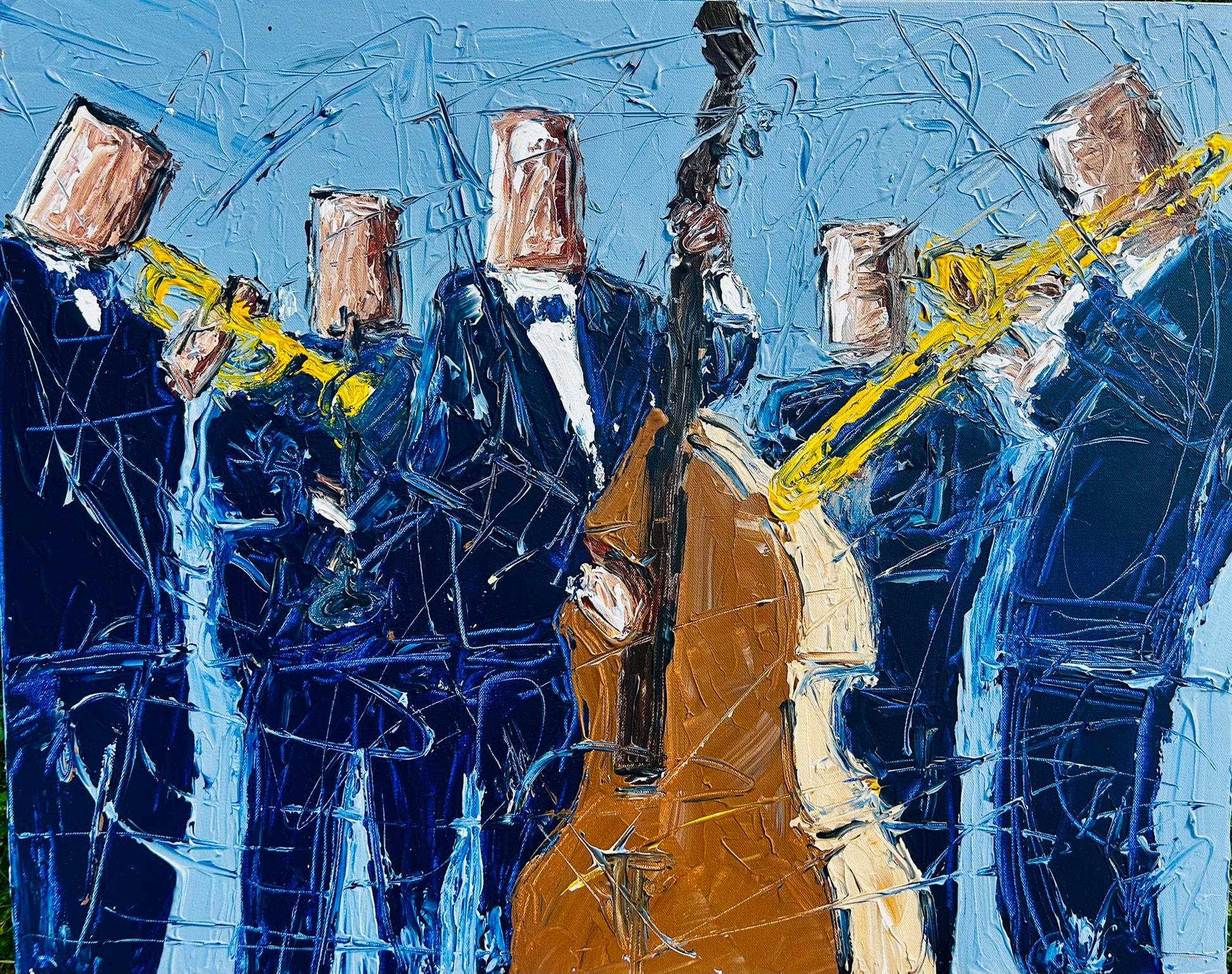 This 20x30 original is saturated in bold blue movement, layered thick with palette knife strokes that create a sculptural surface. The musicians almost dissolve into the color — like sound waves blending into the night air during a late set.