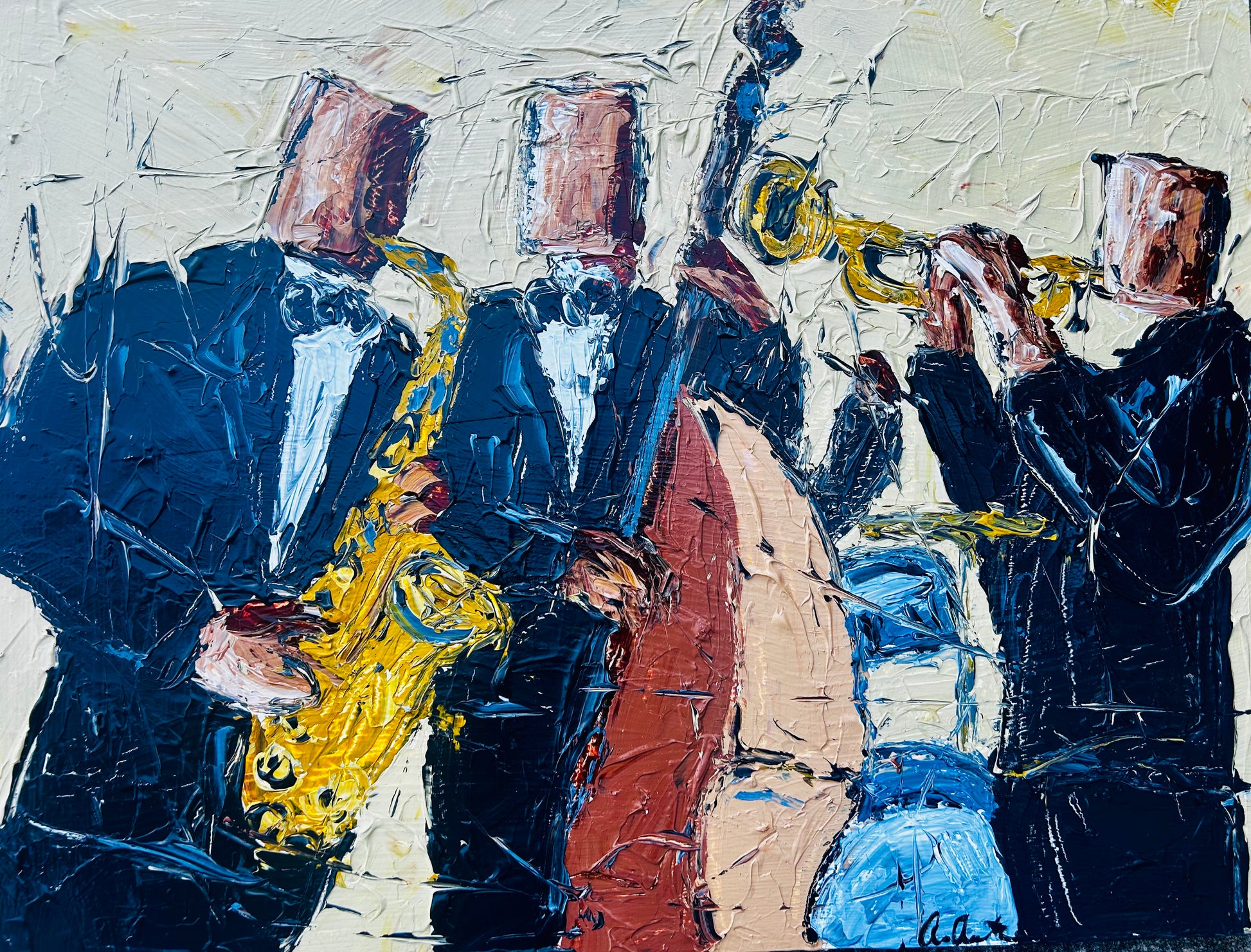 This piece captures the energy and harmony of a jazz trio mid-performance — the sax, trumpet, and upright bass blending together in a colorful symphony of movement and emotion. Thick, textured strokes of oil paint give this artwork a sense of rhythm you can almost hear.