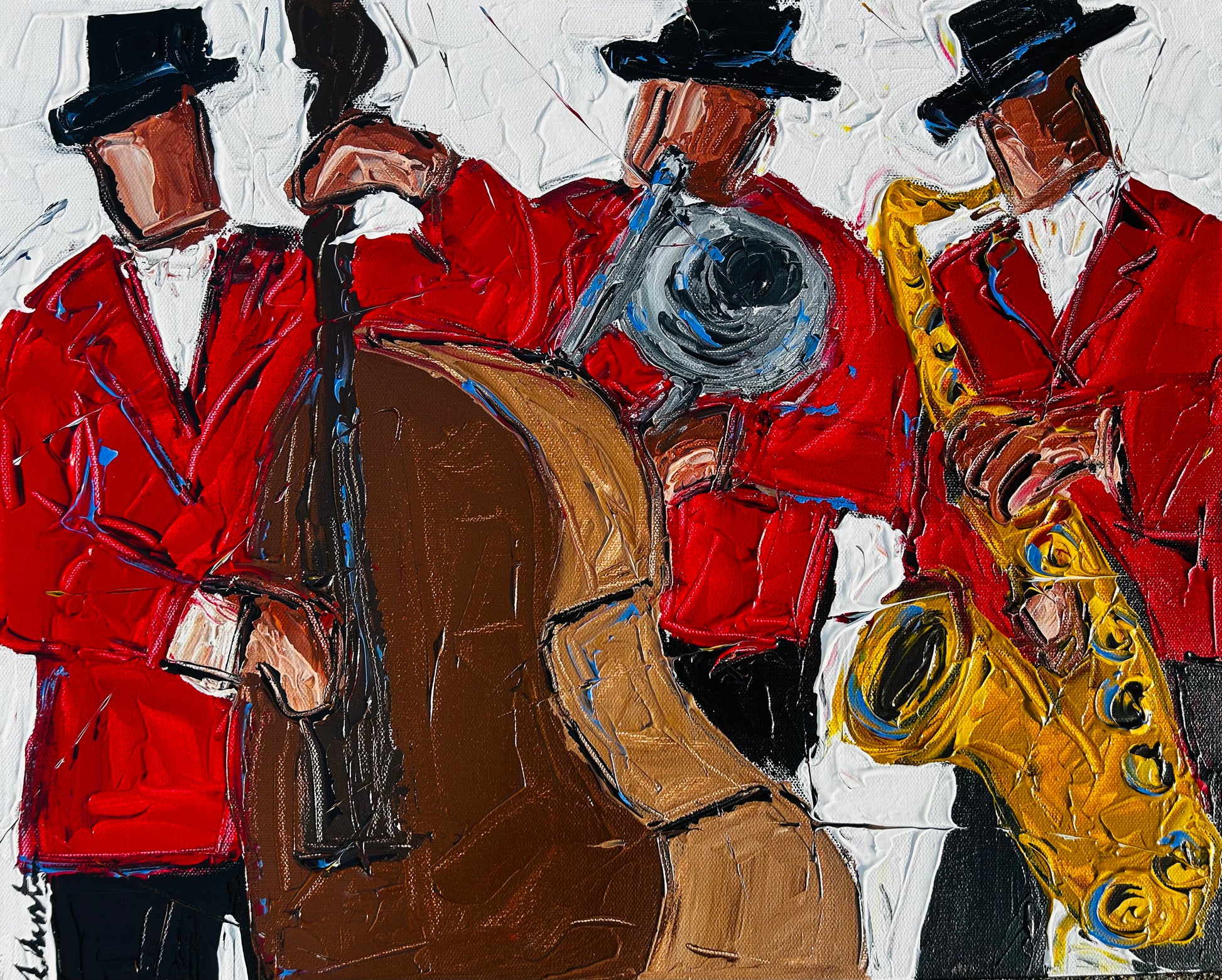 This 16x20 original painting puts the spotlight on the rhythm section—upright bass, saxonphone and trumbone, and attitude. The bold red jackets hit hard against a textured white background, making the figures feel loud even in silence. Thick palette-knife strokes give the piece weight, movement, and grit. Nothing here is delicate. That’s the point.